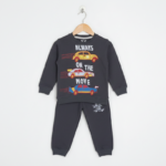 A stylish burgundy romper featuring a playful bear in sunglasses, perfect for keeping little ones comfy and trendy.